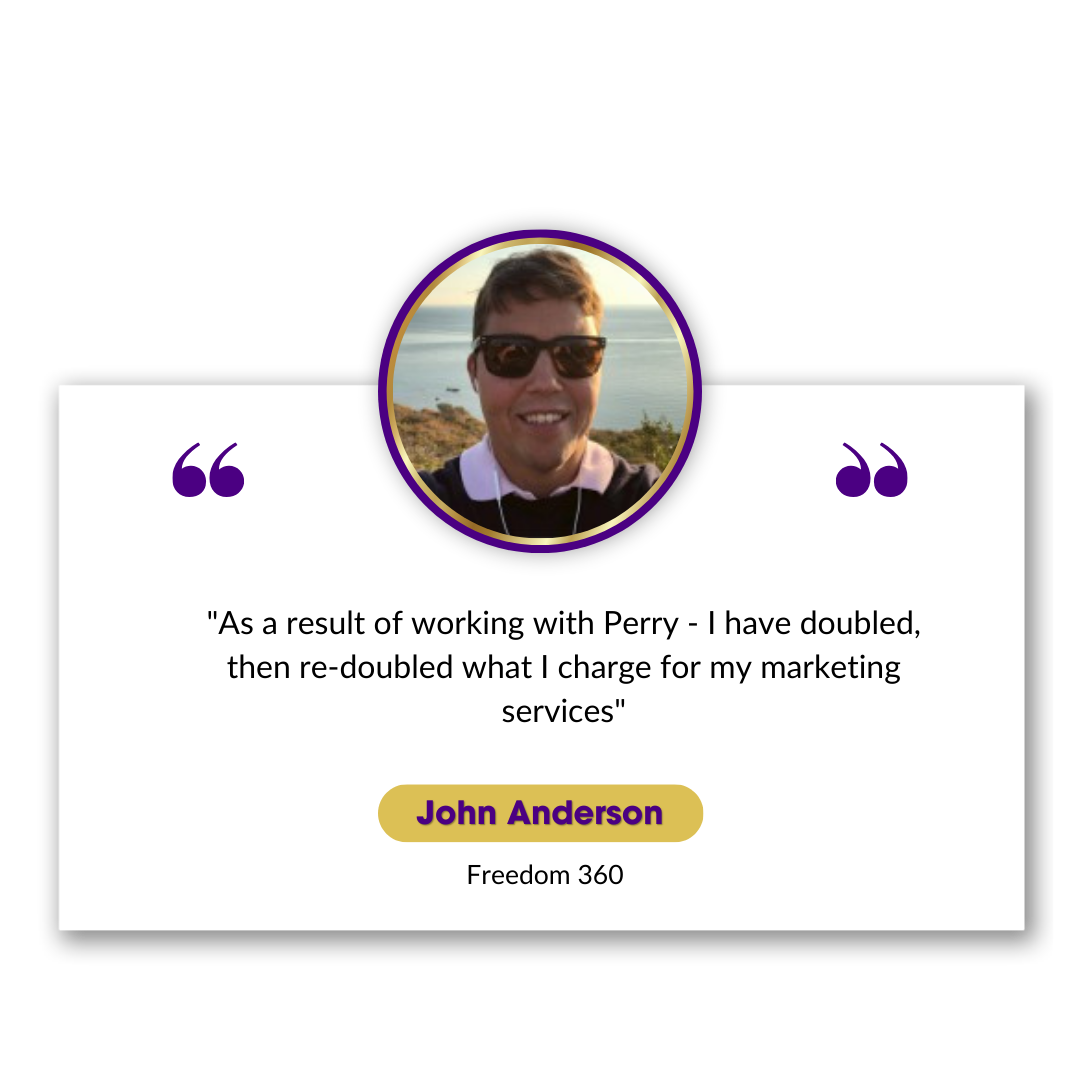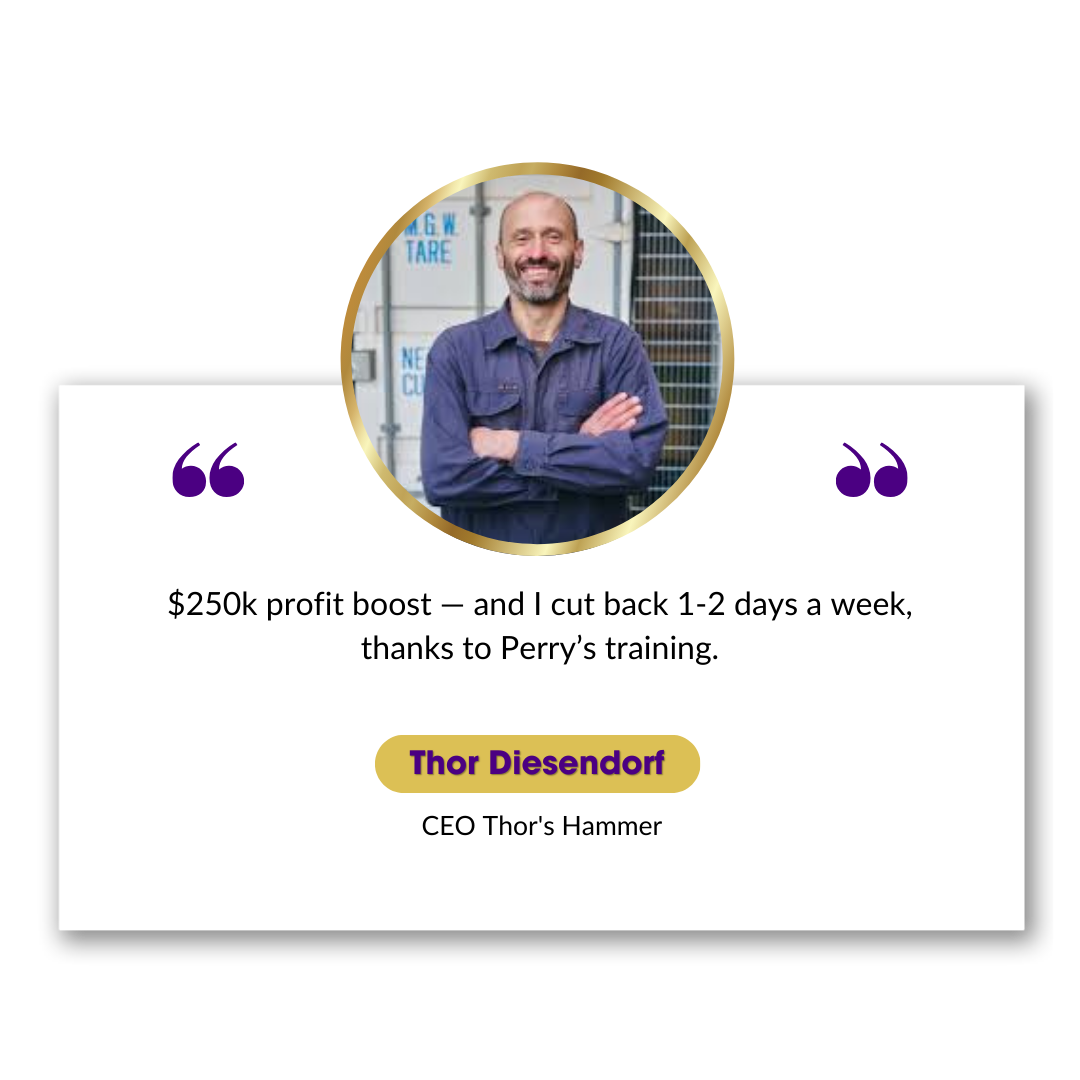 The second: the IP and strategic experience to get business owners out of day-to-day operations entirely — building the business so it runs completely and profitably without them. Choose your own hours. Only do the work you love. Over 65 business owners now run this style of business with Perry’s methodology.